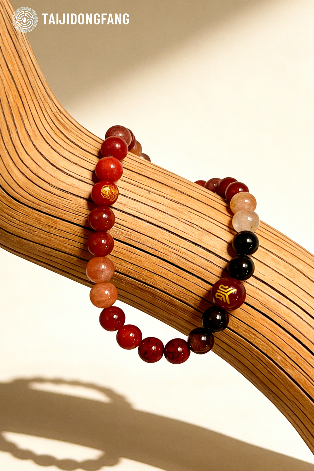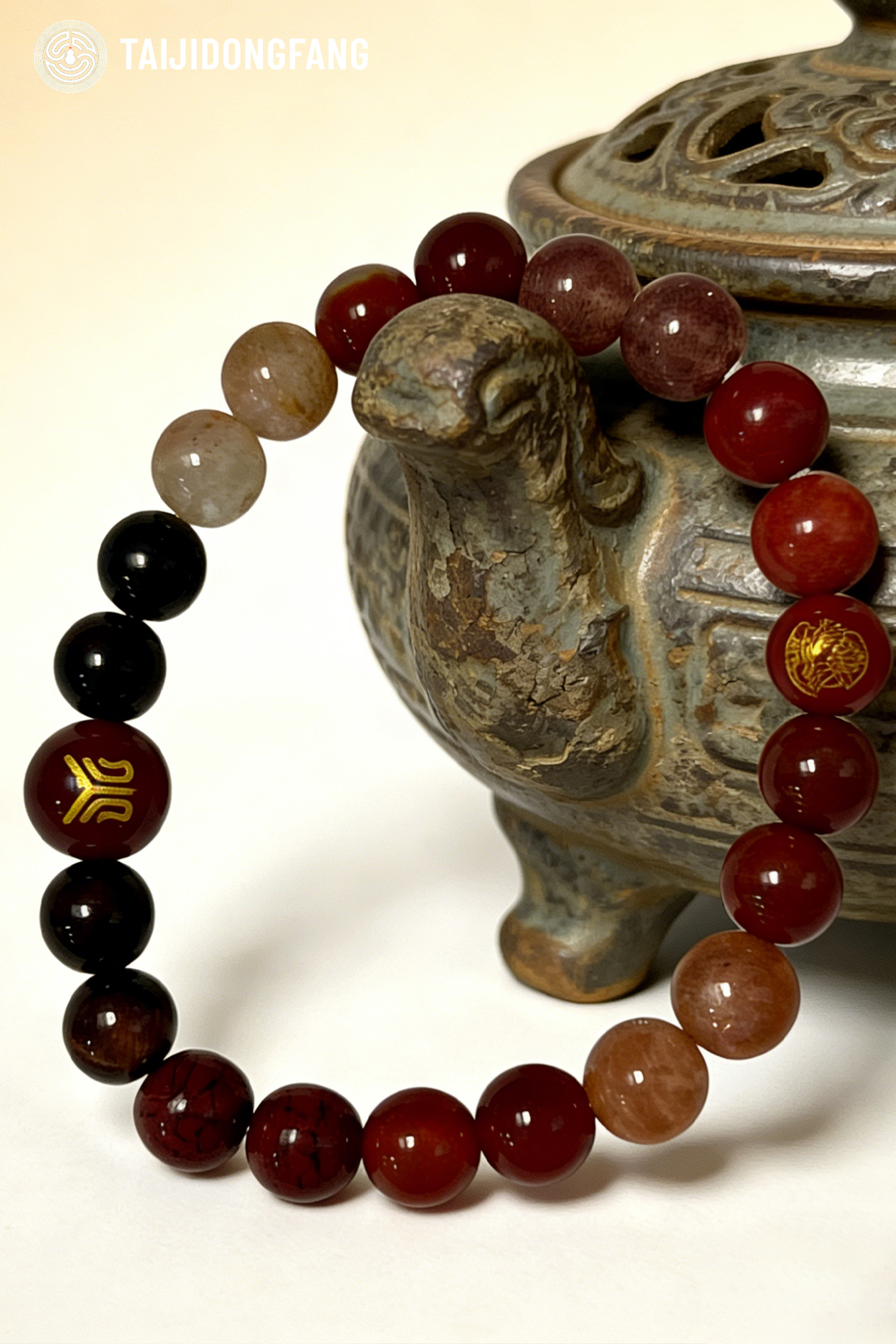 This handcrafted red-toned multi-gemstone bracelet features a curated blend of natural crystals, including red agate, carnelian, obsidian, sunstone, and smoky quartz, adorned with hand-engraved sacred feng shui symbols. Rooted in traditional Chinese metaphysics, it is a powerful amulet for warding off negative energy, attracting good fortune, and boosting vitality.