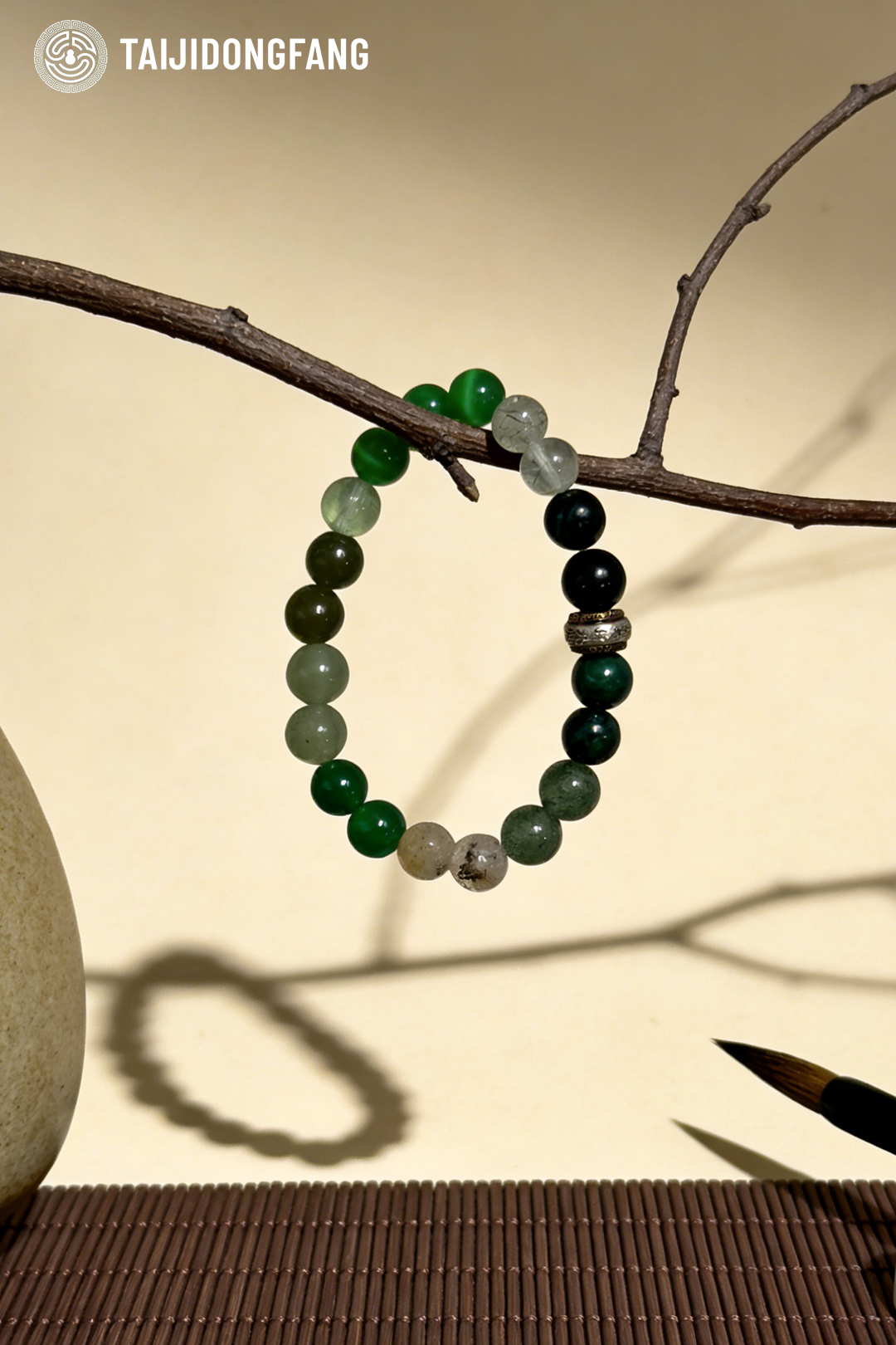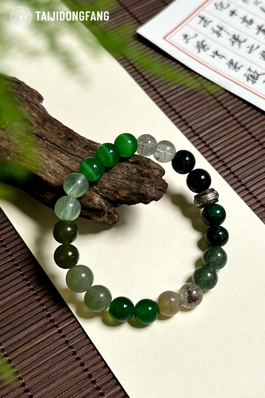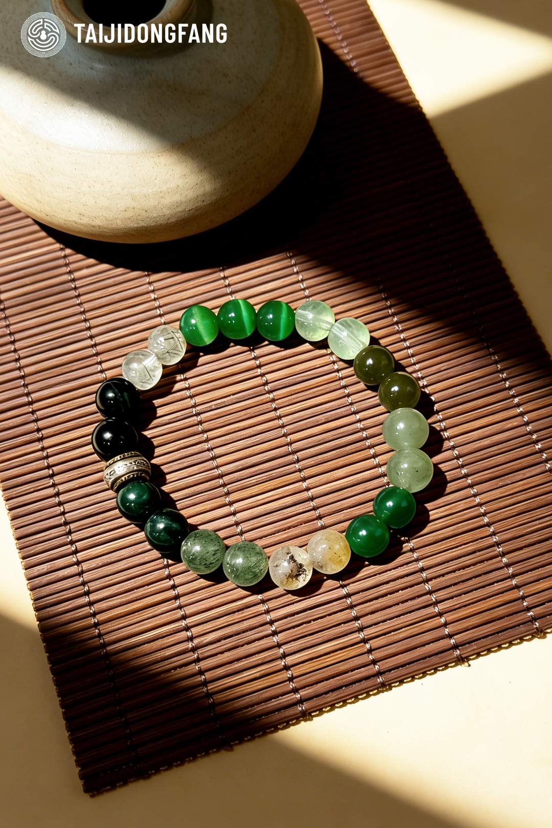 This exquisitely handcrafted bracelet features a harmonious blend of Green Phantom (Rutilated Quartz), Green Aventurine, Onyx, and Green Jade beads. Rooted in traditional Chinese feng shui metaphysics, this piece is a powerful talisman for manifesting wealth, enhancing career vitality, and warding off negative influences.