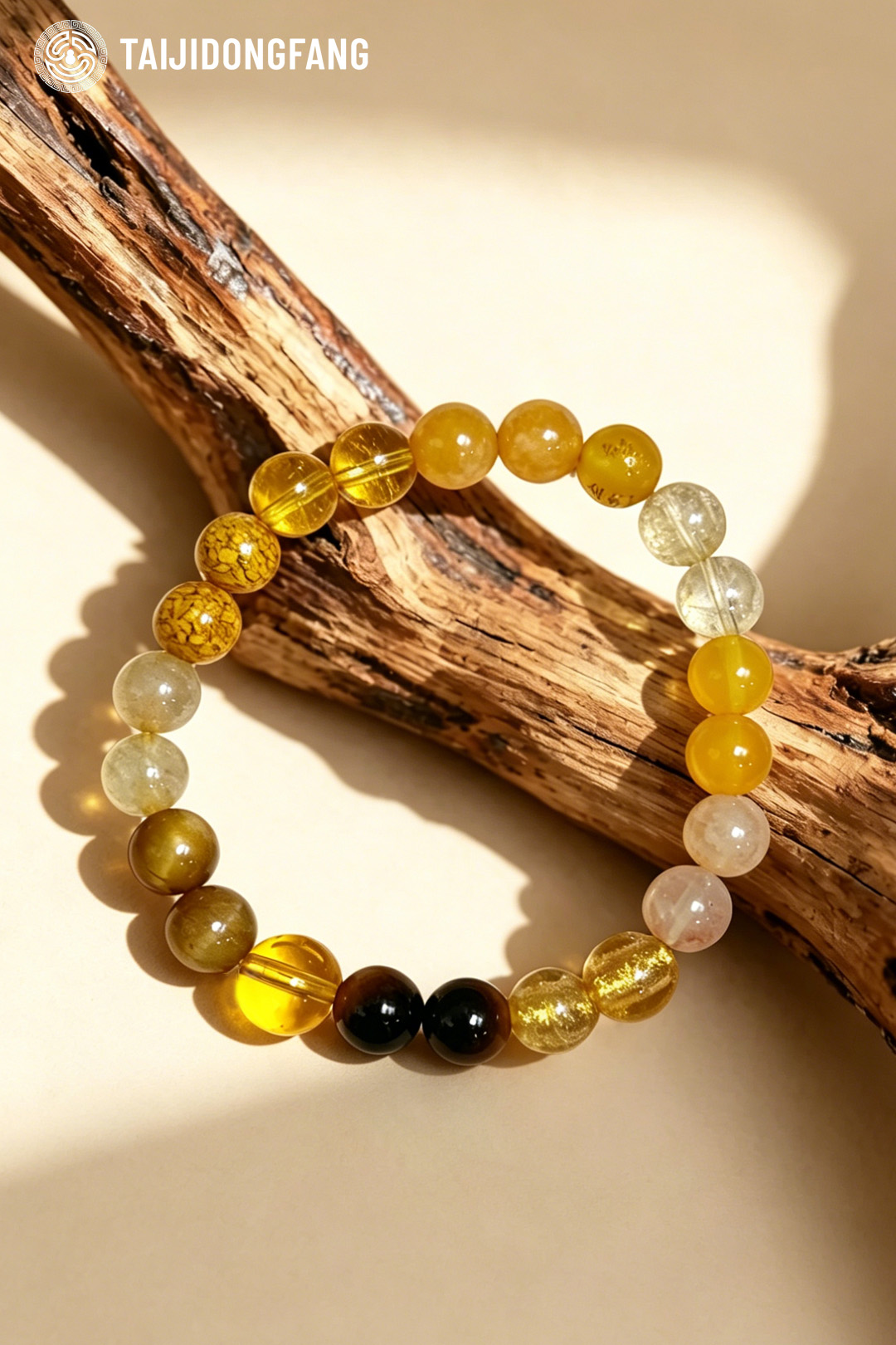 This handcrafted yellow-toned multi-gemstone bracelet features a curated blend of natural crystals, including citrine, yellow calcite, clear quartz, and obsidian. Designed in traditional Chinese feng shui principles, it is a powerful amulet for attracting wealth, boosting positive energy, and warding off negative influences.